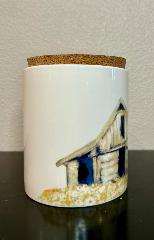 Stoneware Canister w/ Farm Scene and Cork Lid